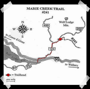 Another way to get to the trail system is to take Mullan Trail exit off I-90. Then turn north and follow to Sunnyside Rd. Then turn left and stay to the left at fork in road. Road turns to gravel and then follow down the hill. At stop sign turn left onto Yellowstone Trail and then right onto Landing Road to the boat dock and parking. Or continue on Yellowstone Trail another 1/4 mile to upper main parking lot.