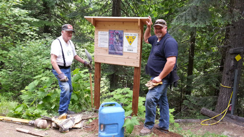 Photo by: Karen Kimball shows Bob and Darin Lovitt installing signage at 4th of July trailhead. |