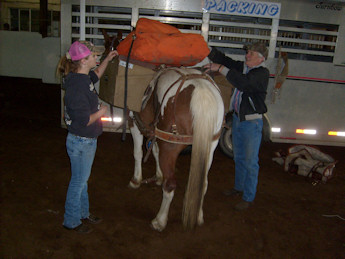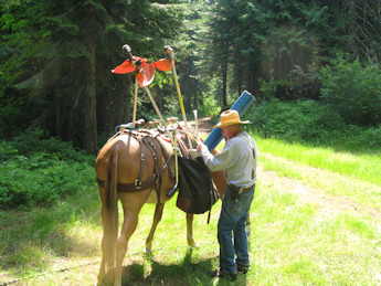 Bob Funke loads his mule with equipment.