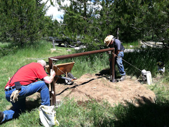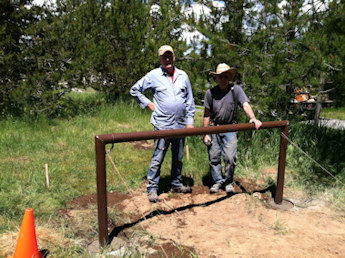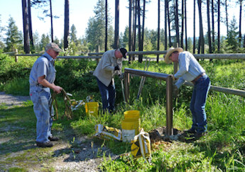 On July 5, 2014 Bob Lovitt and his son Darin and Karen Kimball went up to the 4th of July Recreation Area trailhead with the wooden frame that Rusty Bailey had constructed. It has 3 signs on it to remind mountain bikes that there could be horses on the trail and what to do when meeting horse riders. These signs have helped with some of the bike riders on Canfield Mtn. trail. also The group took concrete bags and water and the tools they needed and put it in the ground just past the USFS gate.
