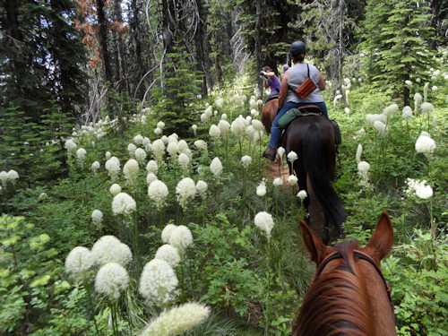 On Sat. we took on Copper Ridge Trail right out of our campsite. We cleared it to the top where the horses and dogs enjoyed munching on the snow drifts. It was quite warm. The Bear Grass was in full bloom and I’ve never seen them so huge and tall. Our boots and stirrups were white from brushing against them on the trail.